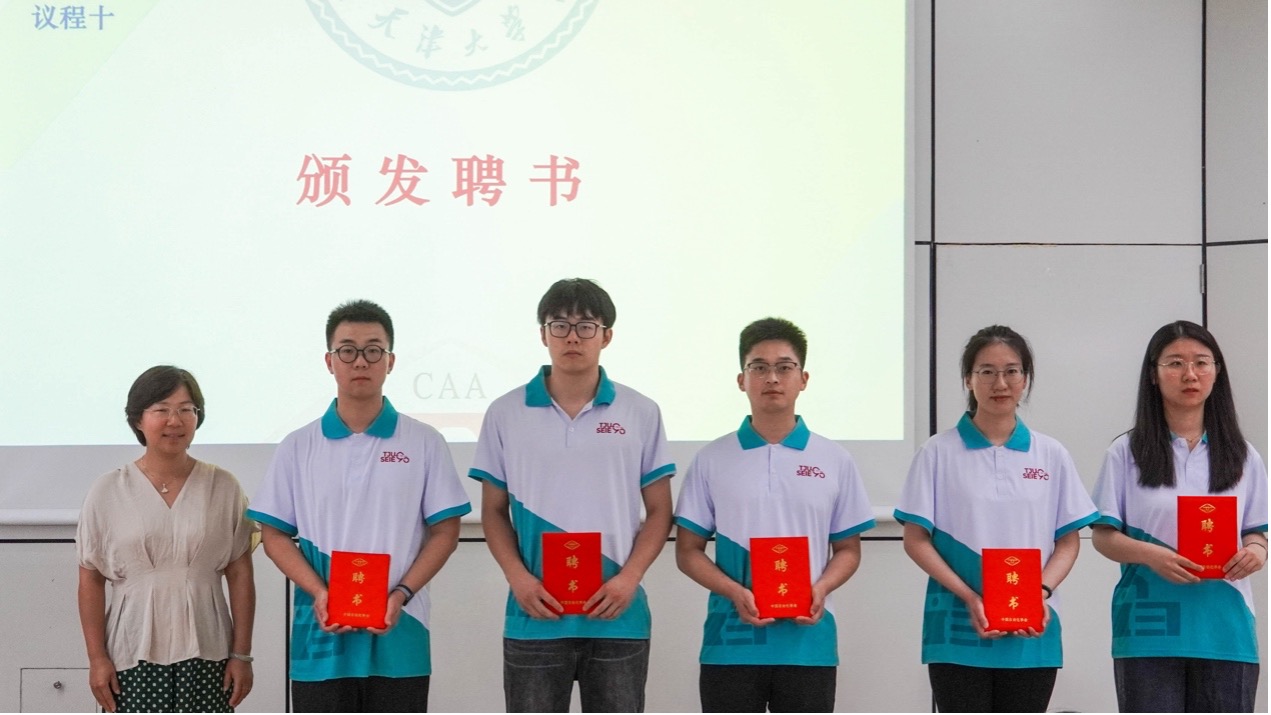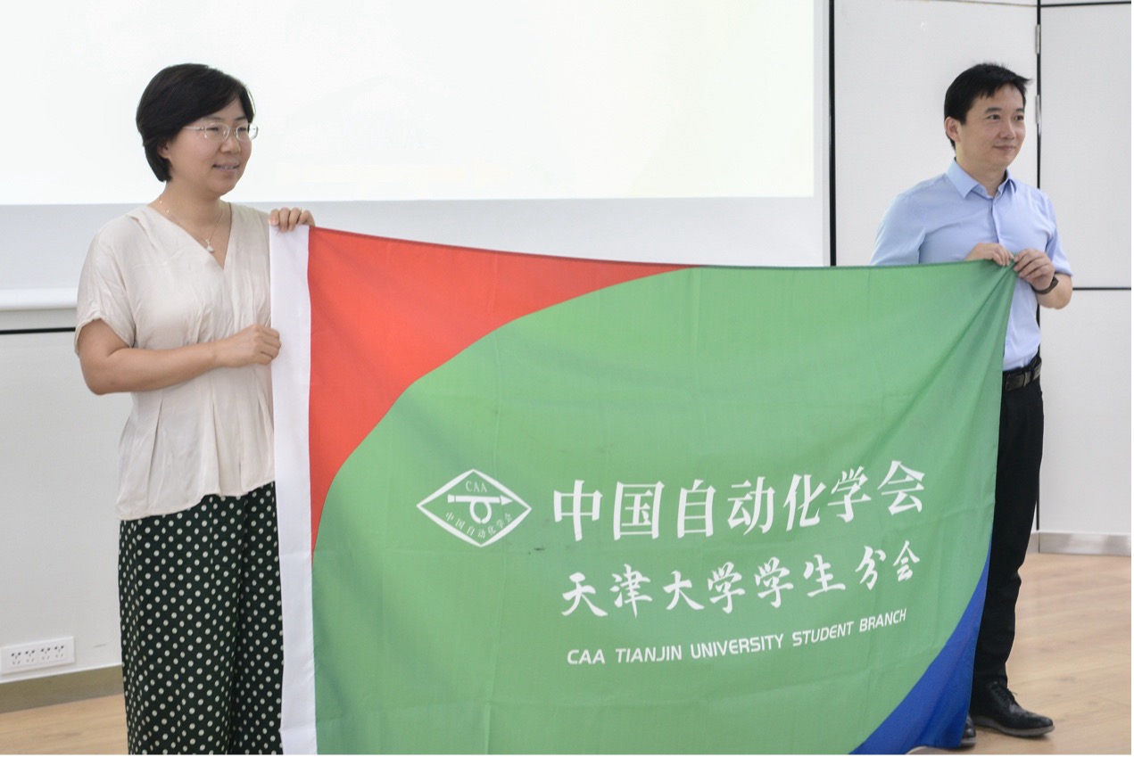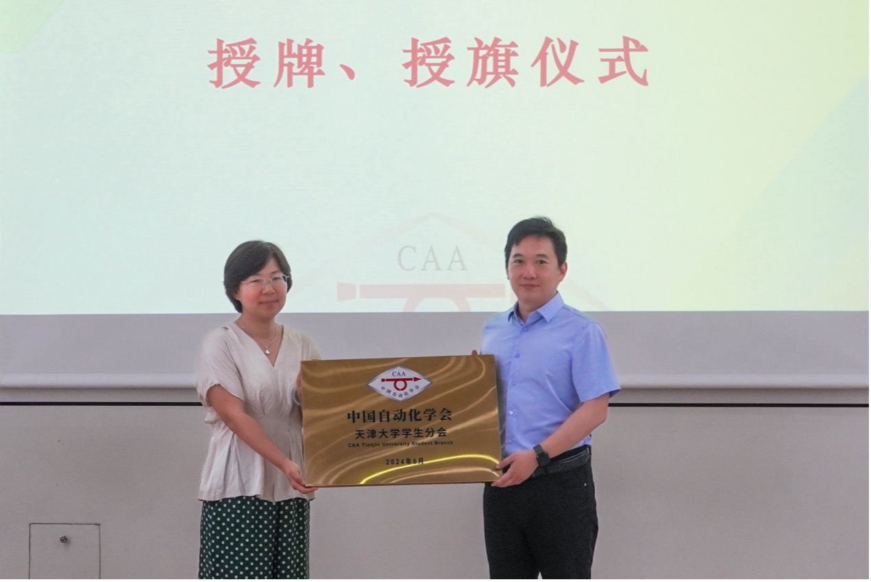 随后,中国自动化学会秘书长张楠向天津大学电气自动化与信息工程学院院长谭超教授授予会牌、会旗,并为中国自动化学会天津大学学生分会首届指导委员会与执行委员会成员颁发聘书。