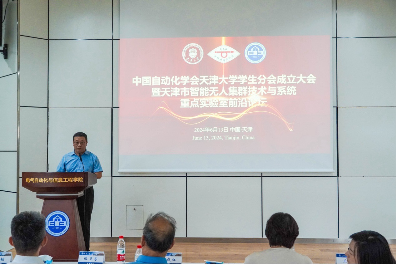2024年6月13日上午,中国自动化学会天津大学学生分会成立大会暨天津市智能无人集群技术与系统重点实验室前沿论坛在天津大学卫津路校区SEIE报告厅顺利举行。本次会议由中国自动化学会主办,天津大学电气自动化与信息工程学院承办。中国自动化学会副理事长王成红研究员,中国自动化学会秘书长张楠、副秘书长王坛,会议邀请了青岛大学侯忠生教授,上海交通大学张卫东教授;华东师范大学李韬教授;东北大学丁进良教授以及清华大学孟子阳教授出席本次前沿论坛。天津大学电气自动化与信息工程学院院长谭超教授、董峰教授本次会议。出席会议的还有天津大学电气自动化与信息工程学院的教师和学生代表。成立大会由天津大学自动化系主任胡超芳教授主持。